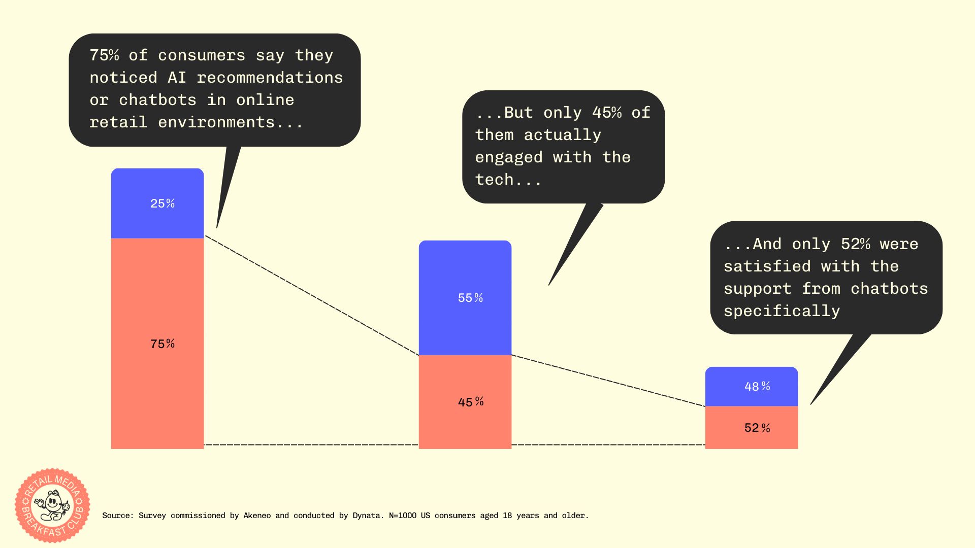 Akeneo, a product experience and product information management company, recently released new data revealing how U.S. consumers are navigating the rise of AI in their online shopping journeys. Their survey of 1000 consumers found that while 75% of consumers have encountered AI recommendations or chatbots online, only 44% actually engaged with them. Yikes.