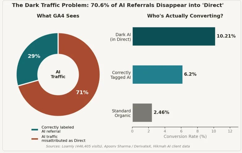 They confirmed something I had suspected ever since writing the piece about Dark Search: that when shoppers click through from AI apps like ChatGPT and Gemini, the referral headers get stripped. Google Analytics categorizes this traffic as "Direct." (As opposed to ChatGPT which adds an explicit referral tag to the outbound link.)