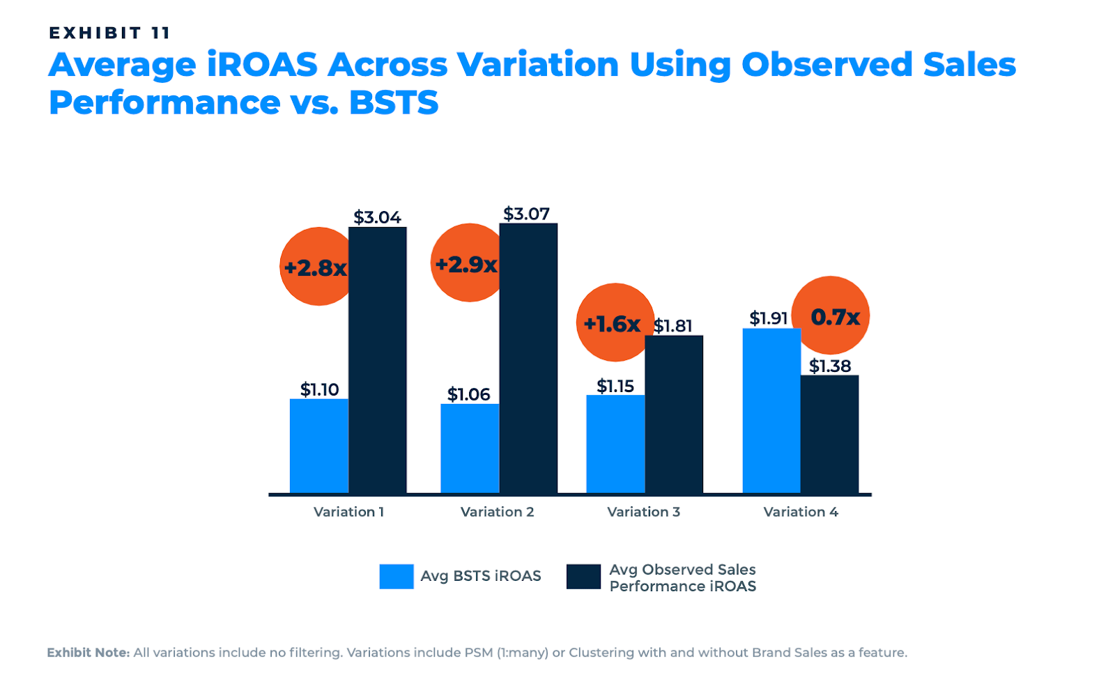 Some specific findings stand out. Propensity score matching produced roughly 12 times better match quality than clustering, as measured by standard mean difference across covariates. But it also tended to produce lower iROAS estimates. Whether or not historical brand sales were included as a matching feature could swing the average iROAS from $1.23 to negative $0.14. And the two approaches to calculating incremental revenue — observed sales performance versus a Bayesian structural time series model — diverged by an average of 90%.