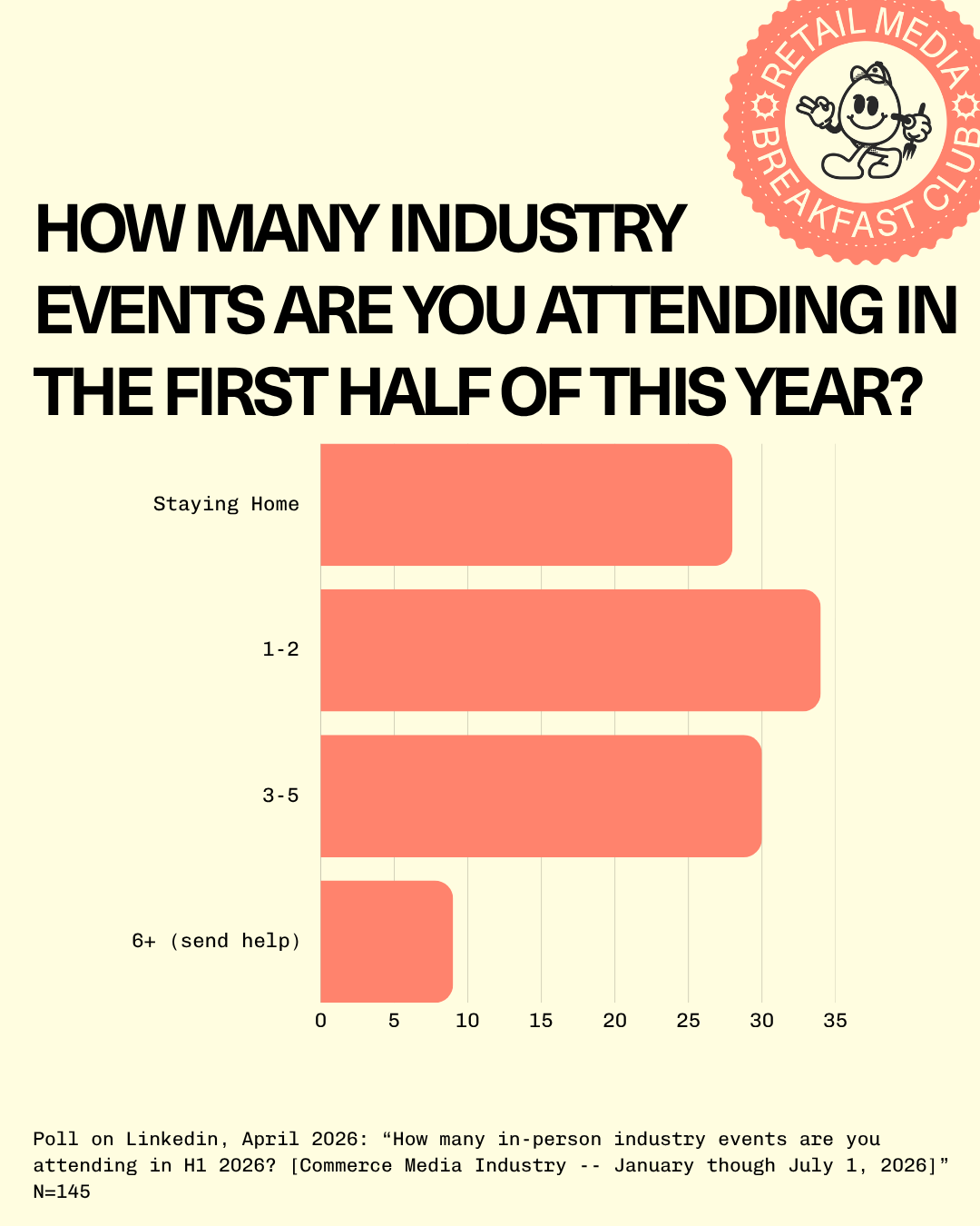 A couple of weeks ago I ran a LinkedIn poll asking people in commerce media how many in-person industry events they're attending in H1 2026. 145 people voted. The number that jumped out wasn't the people doing three-to-five, or the 9% of road warriors doing six or more. It was this: 28% of respondents aren't attending a single in-person event in the first half of 2026.