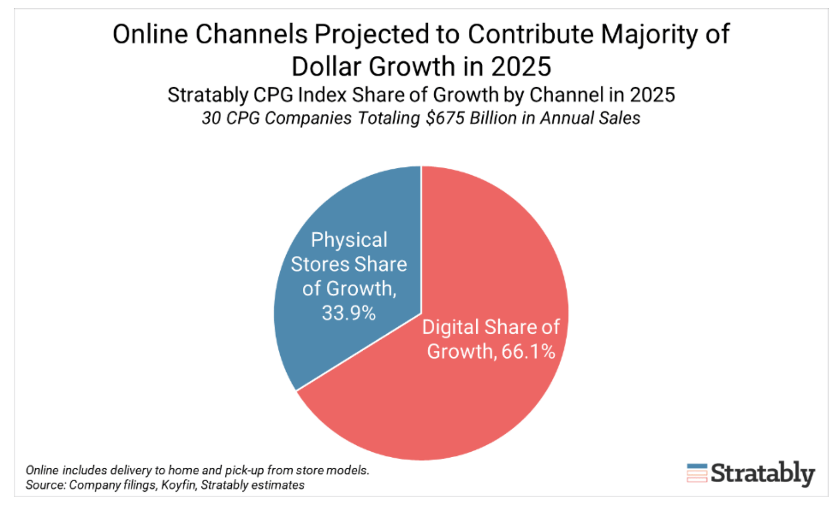 According to Stratably's extensive analysis of 30 major CPG brands - collectively representing $675 billion in global sales - we're witnessing a decisive shift in how CPG brands achieve growth. The data tells a compelling story: digital channels were responsible for all CPG growth in 2024, while physical store channels actually declined by -0.3%. This trend is accelerating, with digital projected to drive two-thirds of all CPG growth in 2025.