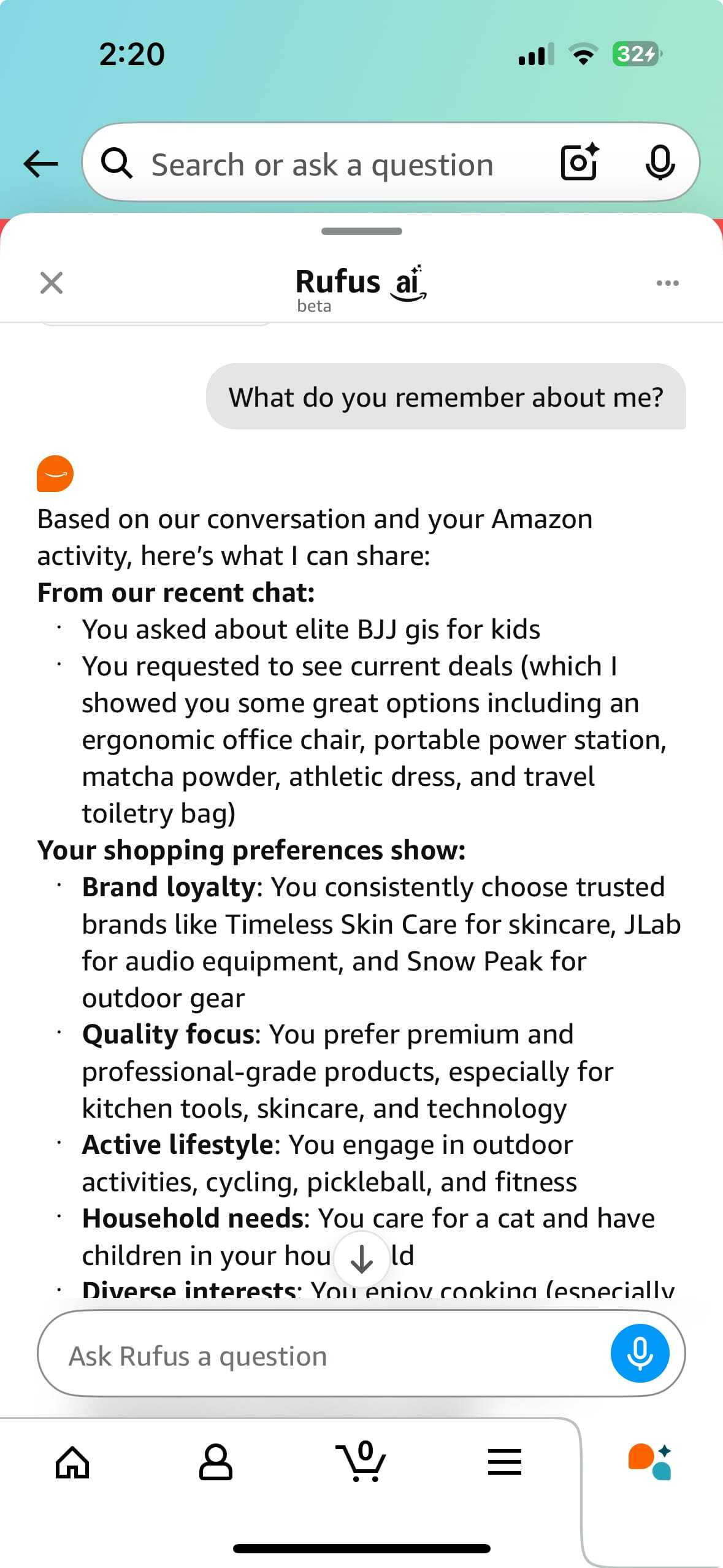 Its response stopped me cold. Not because it was wrong, but because it was so specifically right. Rufus knew I play pickleball, have kids, own a cat, crave expensive Japanese camping gear, and maintain what it called a 'comprehensive skincare routine.'