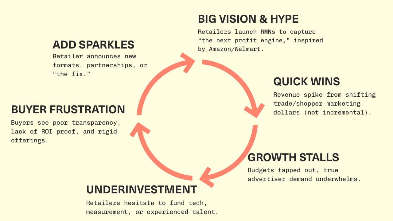 Initially, there's a growth spike. The retailer sees quick wins because they're essentially repackaging existing trade and shopper marketing spend as "retail media." But then growth slows down hard, because those trade dollars run out. At this point, the retailer faces a choice: invest in better technology, hire experienced ad tech talent, and build a real media business, or coast on the initial momentum.