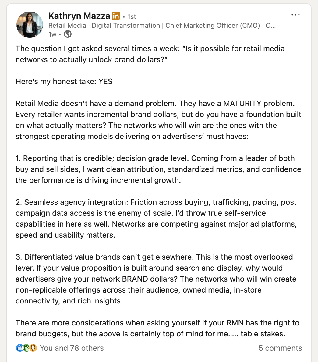 This was sparked by a LinkedIn post from Kathryn Mazza, who formerly headed up the retail media networks at Hy-Vee and Dick’s Sporting Goods. Kathryn laid out the maturity requirements RMNs need to meet before they have any right to ask for brand dollars — credible reporting, seamless agency integration, and differentiated value. Jordan zeroed in on the reporting piece, and what "credible" actually means depending on who's asking.