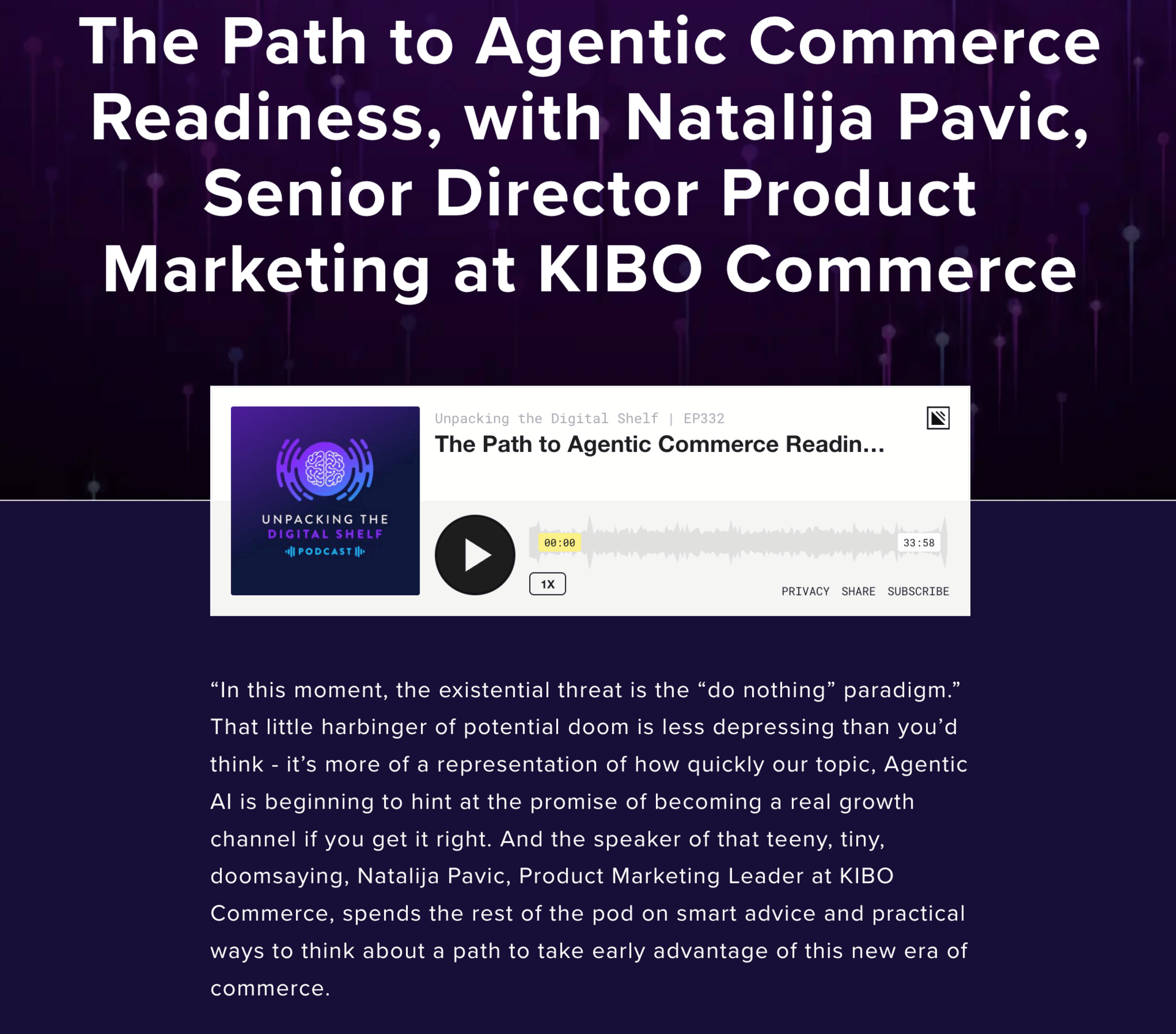 Today I'm sharing some snippets from one of my favorite podcasts, Unpacking the Digital Shelf podcast, hosted by one of my ecommerce besties, Lauren Livak Gilbert, and Peter Crosby from the Digital Shelf Institute. In a recent episode they interviewed Natalija Pavic, Senior Director of Product Marketing at KIBO Commerce. Natalija addressed something that's been bugging me for months: we can't just add AI features to existing commerce experiences and call it a day.